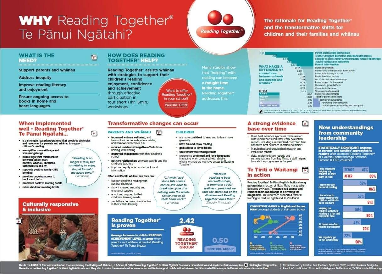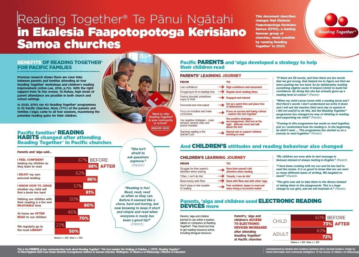 A summary of the key findings from the report showing the delivery of Reading Together® Te Pānui Ngātahi in EFKS was also developed in A3 infographics in both English and Samoan language versions: